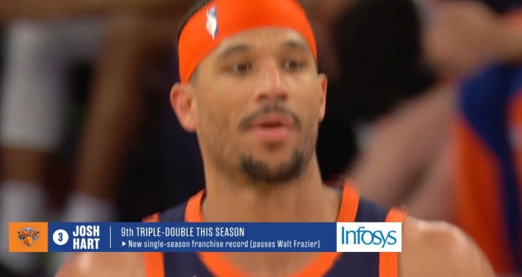目前,約什-哈特已經(jīng)得到了13分11籃板10助攻,這是他個(gè)人本賽季第9次三雙,超越沃爾特-弗雷澤,創(chuàng)尼克斯單賽季三雙紀(jì)錄。