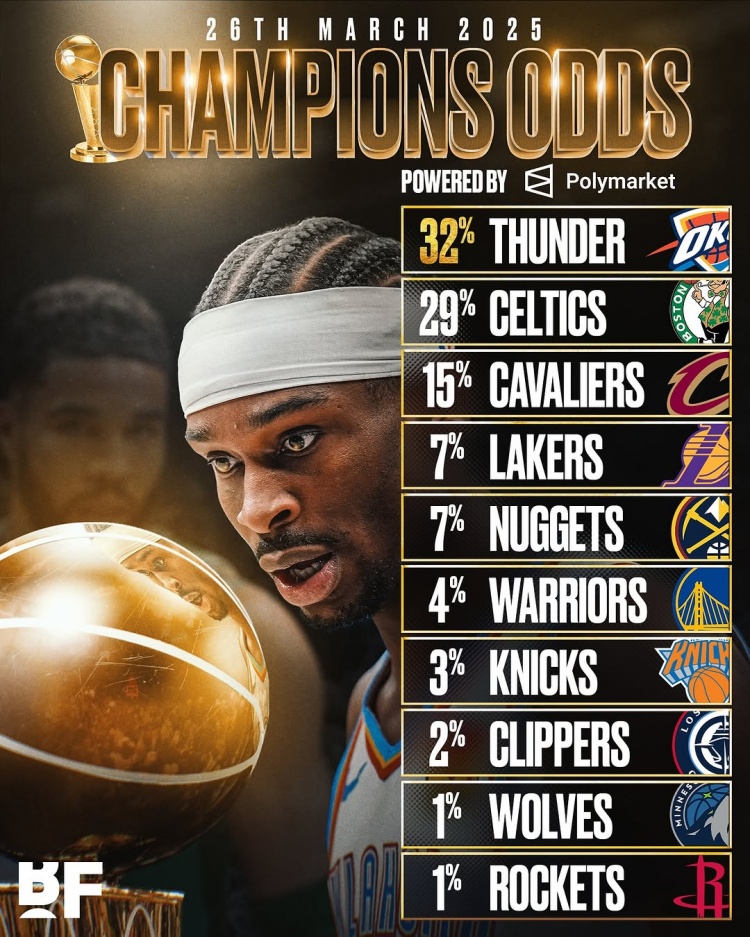 賽季奪冠概率:雷霆第一壓綠軍 湖人掘金7% 勇士4% 快船2%