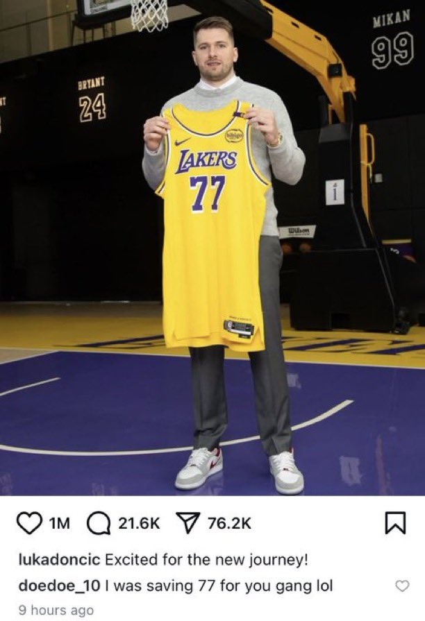 在1月4日,芬尼-史密斯在社媒曬出了自己身穿湖人球衣的照片,東契奇在其帖子下評論:你為什么不選77號?