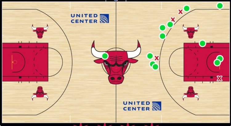 比賽最后時(shí)刻,基迪超遠(yuǎn)三分絕殺湖人,這記三分的距離為14.17米(46.5英尺),是公牛隊(duì)史最遠(yuǎn)絕殺。