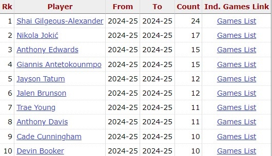 據(jù)統(tǒng)計(jì),這是亞歷山大本賽季第25場(chǎng)比賽至少35分,聯(lián)盟最多,其余人最多17次。