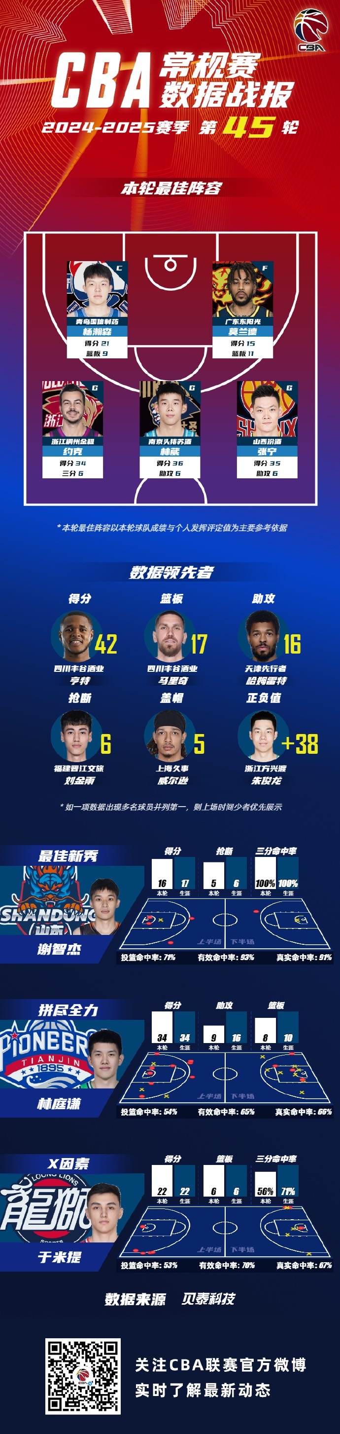 第45輪最佳新秀由來自山東高速籃球俱樂部的謝智杰獲得;