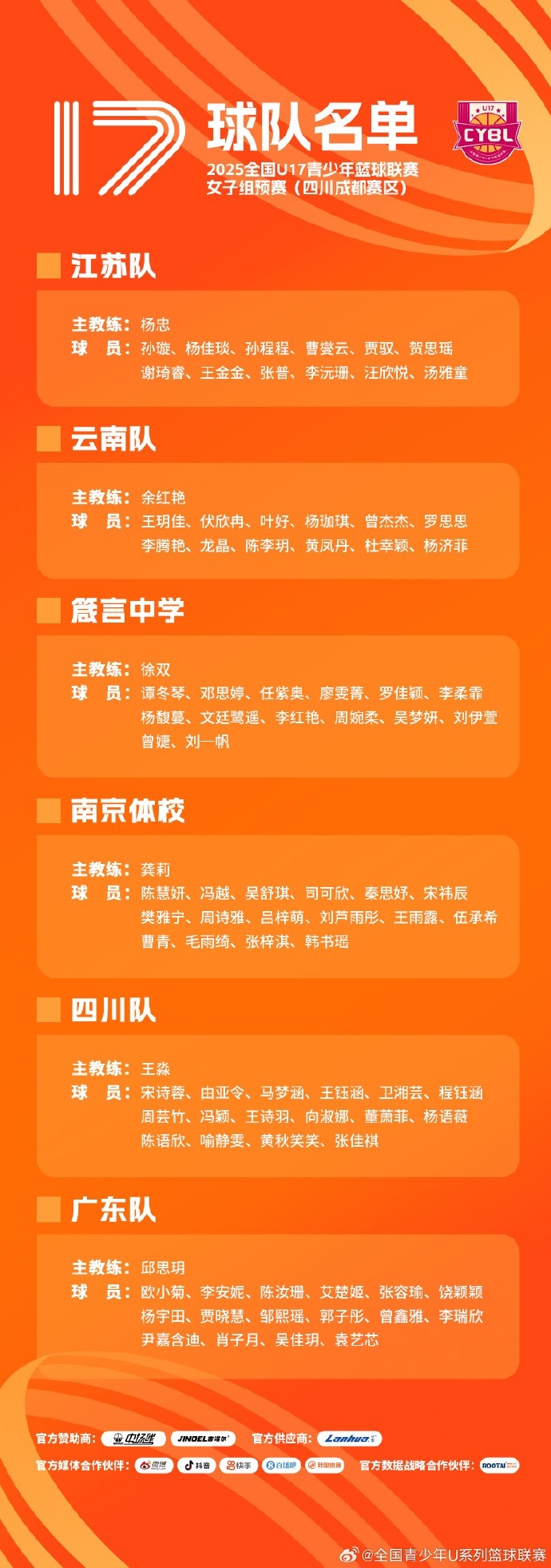 4月7日-13日,2025全國U17青少年籃球聯(lián)賽女子組預(yù)賽將分別在四川成都賽區(qū)和河北秦皇島賽區(qū)同時進(jìn)行,參賽隊伍、運動員名單如下: