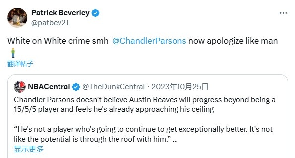 今天,貝弗利則打臉帕森斯,轉(zhuǎn)發(fā)了后者曾說“里夫斯15+5+5就已經(jīng)到極限了”的言論,并寫道:“白人看不起白人,無語了,像個男人一樣出來道歉!”