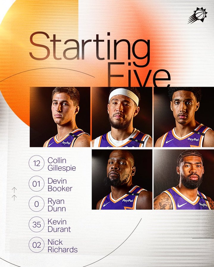 賽前太陽(yáng)公布了本場(chǎng)首發(fā)陣容:吉萊斯皮、布克、瑞安-鄧恩、杜蘭特和理查茲。