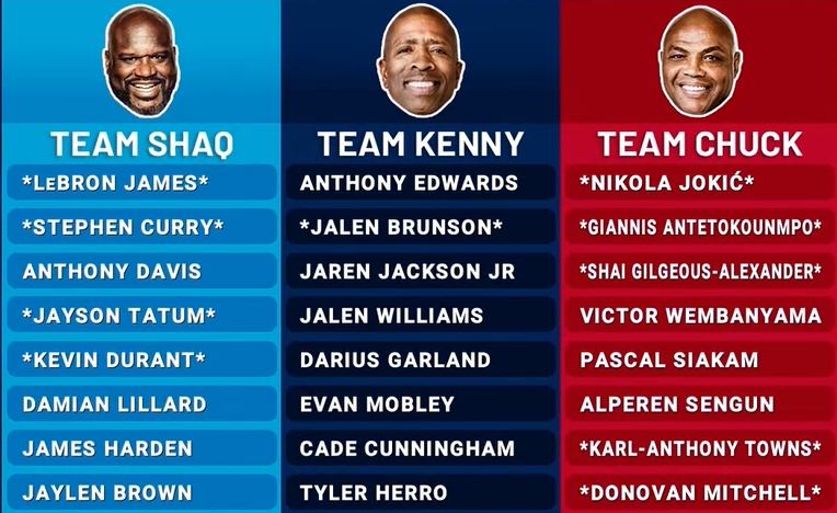 02月07日訊 TNT今日直播NBA全明星正賽選人,奧尼爾、肯尼和巴克利分成三隊進行蛇形選人,不區(qū)分首發(fā)和替補。