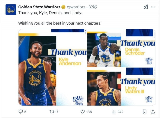 “謝謝你們,李凱爾、施羅德、沃特斯!祝你們在新的旅程中一切順利!”勇士官推如此寫道。