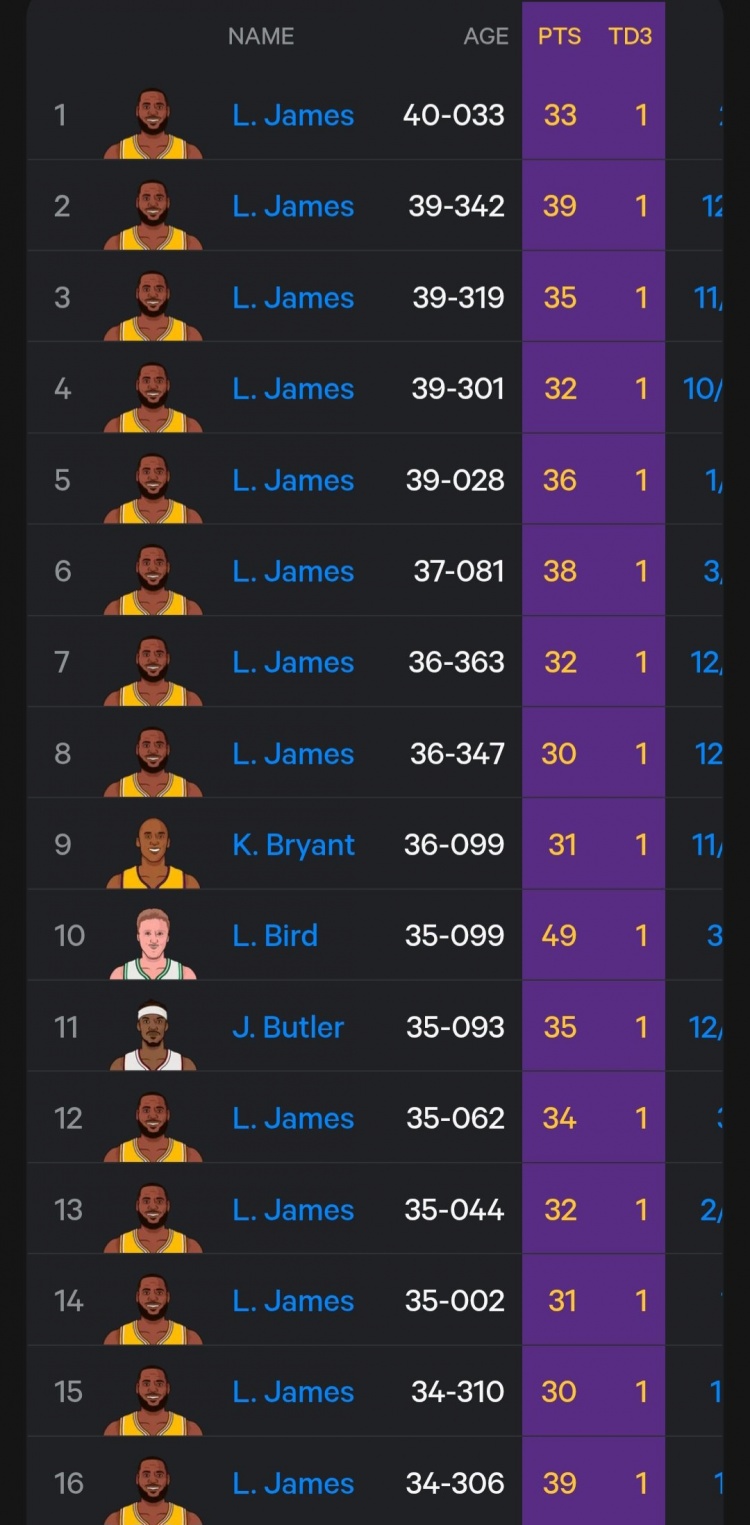 至此,40歲33天的詹姆斯再次刷新了自己保持的“聯(lián)盟砍三雙最老的球員”紀(jì)錄,原先紀(jì)錄是在詹姆斯39歲342天的時(shí)候創(chuàng)下。