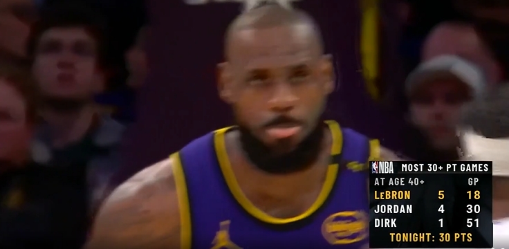 40歲之后詹姆斯已經(jīng)砍下5次30+排名歷史第一,是其他人之和(喬丹4次+諾維茨基1次),值得一提的是,詹姆斯40歲之后還只打了18場比賽。