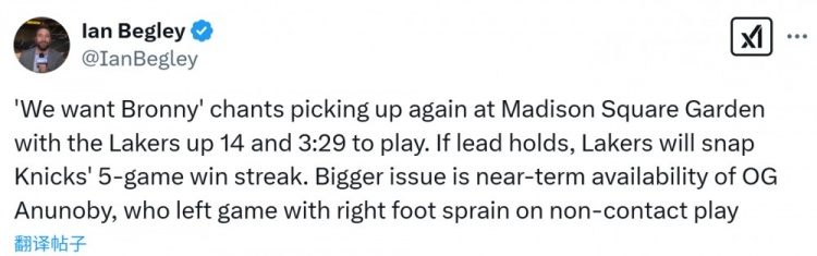 據(jù)尼克斯隊(duì)記Ian Begley報(bào)道,比賽第四節(jié)末段,尼克斯主場球迷喊起了“我們要布朗尼”。