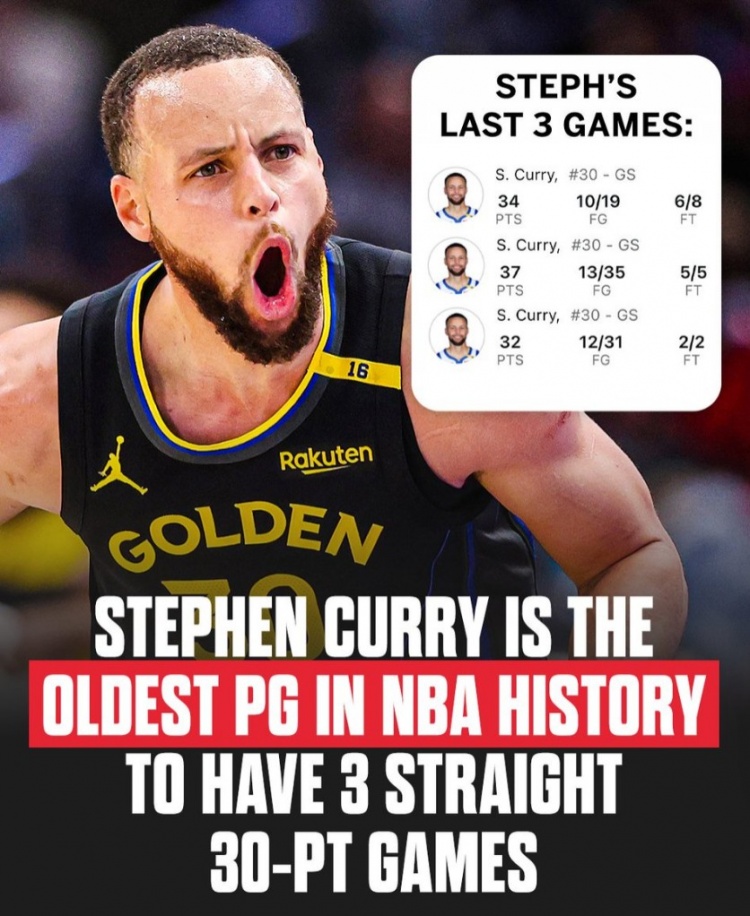 在過(guò)去的三場(chǎng)比賽中,庫(kù)里皆得到30+,他成為NBA歷史上第二位在36歲還能連續(xù)三場(chǎng)30+的球員,第一位是喬丹。