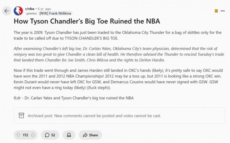 6年前reddit網(wǎng)友發(fā)帖:錢德勒的大腳趾毀了NBA
