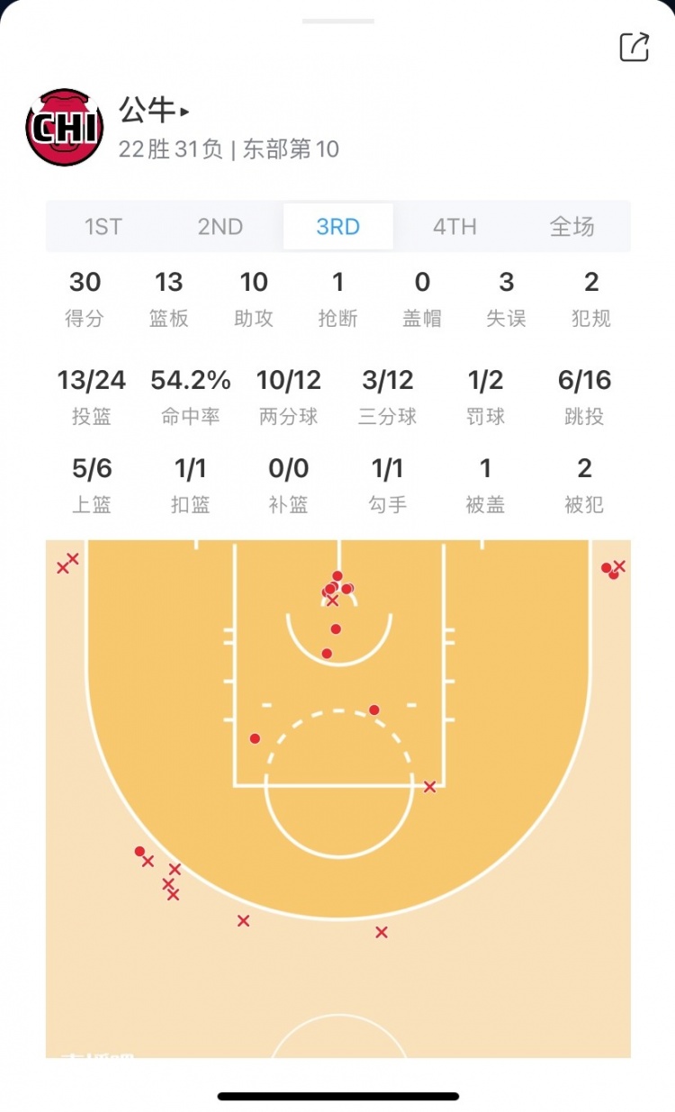 第三節(jié),公牛進攻端終于回暖,外線三分也命中3記,內(nèi)線攻筐效率很不錯,單節(jié)砍下30分,超上半場兩節(jié)之和(29分);布澤利斯單節(jié)4中4拿到10分。