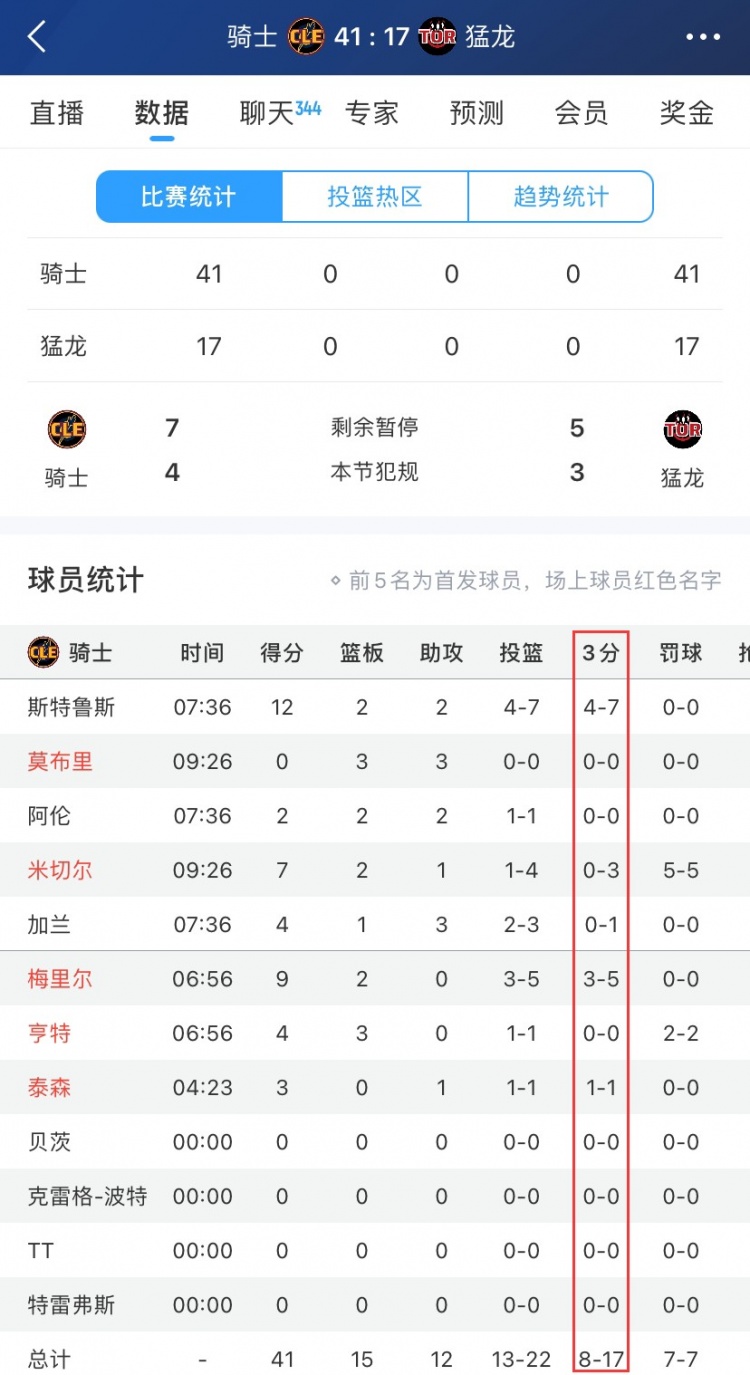 首節(jié)比賽,騎士進(jìn)攻端多點(diǎn)開(kāi)花,除小莫布里外上場(chǎng)7人皆有得分,合計(jì)扔進(jìn)8記三分,單節(jié)轟下41分直接領(lǐng)先到24分!