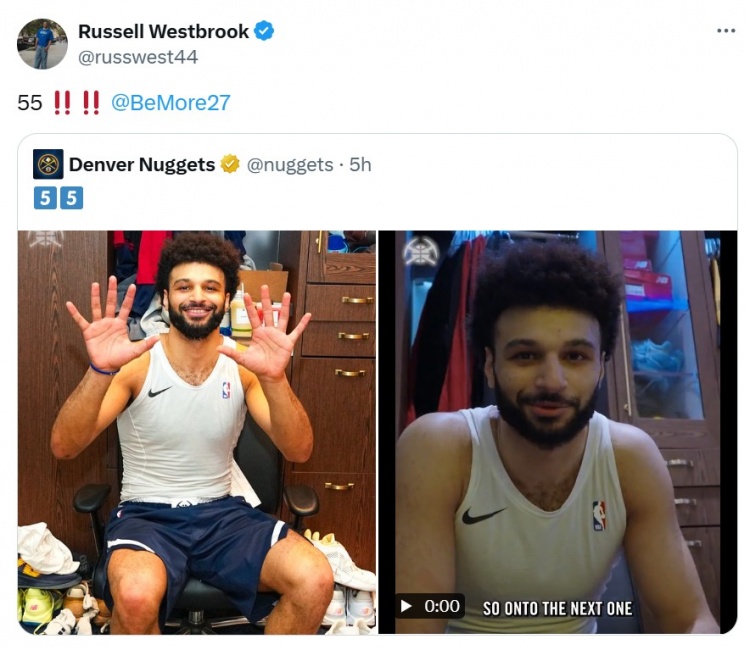 賽后,穆雷在更衣室用兩只手比出了55的手勢(shì),威少轉(zhuǎn)發(fā)道:“55????@穆雷?!?/p>
