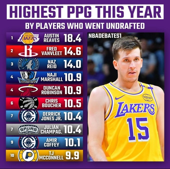 本賽季落選秀場(chǎng)均得分榜:里夫斯18.4分第1 范喬丹&里德排2、3位