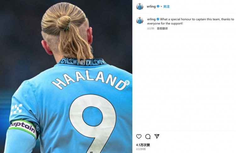 哈蘭德也通過(guò)社媒曬出自己佩戴曼城隊(duì)長(zhǎng)袖標(biāo)的照片,并配文:“非常榮幸第一次成為這支球隊(duì)的隊(duì)長(zhǎng),感謝所有人的支持?!?/p>