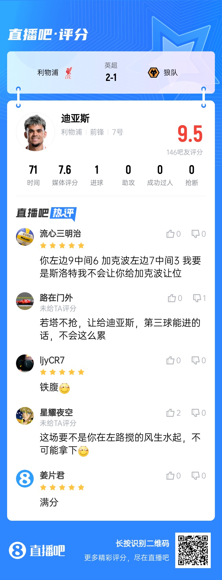 02月16日訊 英超第25輪,利物浦主場2-1戰(zhàn)勝狼隊。本場比賽迪亞斯回歸左邊路,首發(fā)出戰(zhàn)71分鐘,又貢獻一場精彩表演,打入1球并造點。