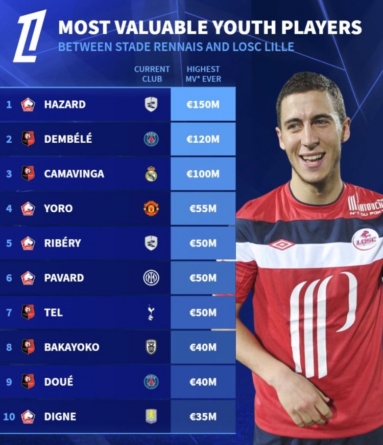 2月17日訊 《轉(zhuǎn)會(huì)市場(chǎng)》統(tǒng)計(jì)了里爾和雷恩兩家俱樂部培養(yǎng)的青訓(xùn)球員歷史身價(jià)最貴榜單,阿扎爾居首。
