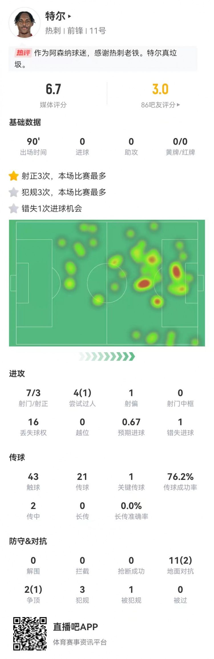 2月17日訊 熱刺在本輪英超1-0擊敗曼聯(lián),特爾本場數(shù)據如下: