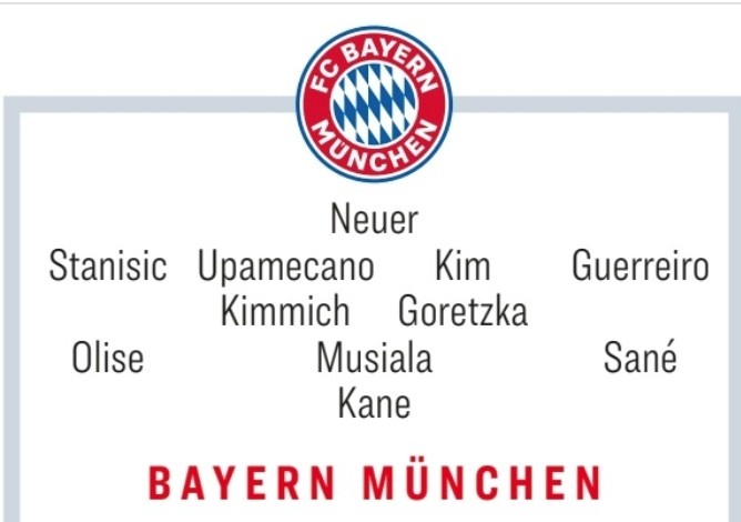 諾伊爾/斯坦尼西奇、于帕梅卡諾、金玟哉、格雷羅/基米希、格雷茨卡/奧利塞、穆西亞拉、薩內(nèi)/凱恩