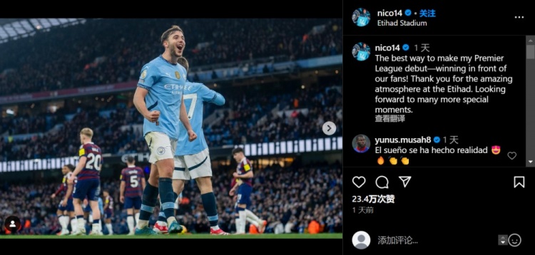 賽后這名中場(chǎng)在社媒發(fā)文紀(jì)念自己的英超首秀:在我們的球迷面前贏下比賽,這是我英超首秀的最佳方式。感謝伊蒂哈德?tīng)I(yíng)造的不可思議的氛圍,期待更多特別的時(shí)刻。