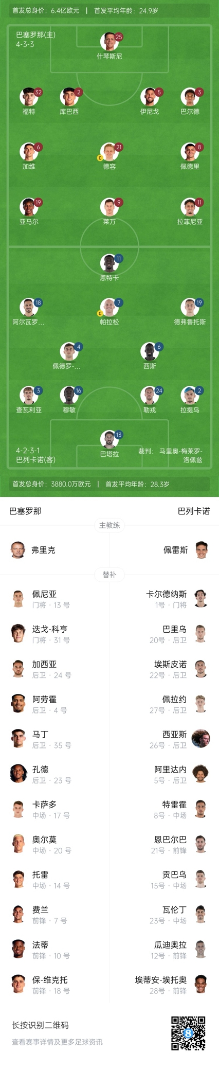 巴薩首發(fā):25-什琴斯尼、2-庫巴西、5-伊尼戈-馬丁內斯、3-巴爾德、32-??送?福特、6-加維、21-德容、8-佩德里、11-拉菲尼亞、19-亞馬爾、9-萊萬多夫斯基