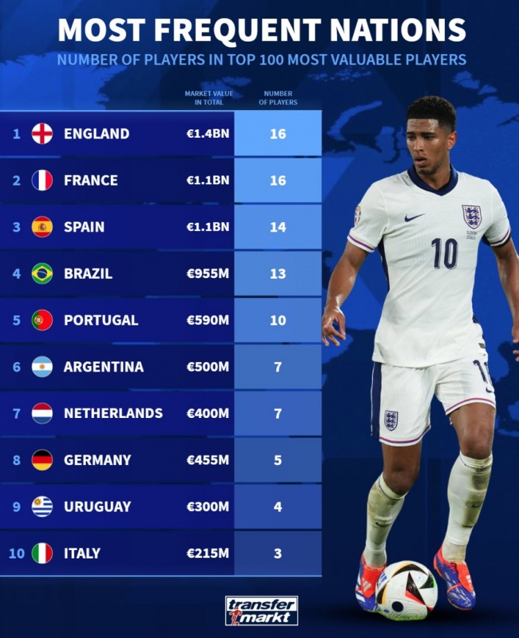 2月18日訊 《轉(zhuǎn)會市場》統(tǒng)計了當(dāng)前身價前100球員的國籍情況,英法并列居首。