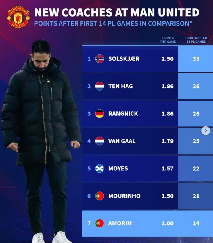 2月18日訊 曼聯(lián)在換帥后成績持續(xù)下滑,《轉(zhuǎn)會市場》統(tǒng)計顯示阿莫林是同期成績最差的主教練。