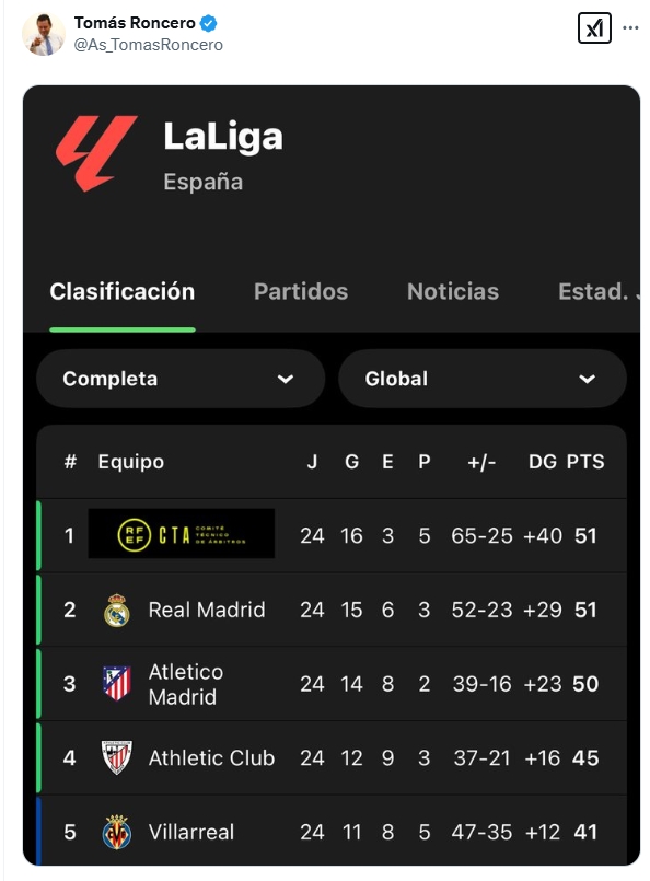 龍賽羅在社媒曬出最新積分榜,將榜首的巴薩的隊(duì)徽換成了裁判技術(shù)委員會(huì)的標(biāo)志。