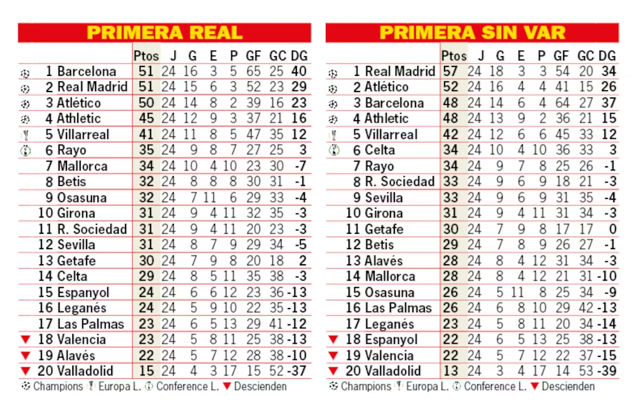 西媒《阿斯報(bào)》撰文提到,本賽季視頻助理裁判導(dǎo)致了積分榜形勢逆轉(zhuǎn),如果沒有VAR,皇馬則會(huì)以5分優(yōu)勢領(lǐng)跑積分榜,而巴薩會(huì)降至積分榜第三名,馬競排在第二位。