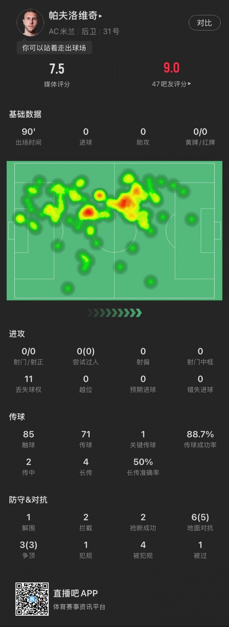 帕夫洛維奇本場主要數(shù)據(jù)↓