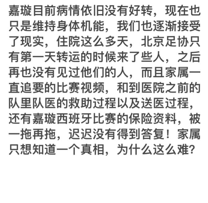 嘉璇目前病情依舊沒有好轉(zhuǎn),現(xiàn)在也只是維持身體機能,我們也逐漸接受了現(xiàn)實,住院這么多天,北京足協(xié)只有第一天轉(zhuǎn)運的時候來了些人,之后再也沒有見過他們的人,而且家屬一直追要的比賽視頻,和到醫(yī)院之前的隊里隊醫(yī)的救助過程以及送醫(yī)過程,還有嘉璇西班牙比賽的保險資料,被一拖再拖,遲遲沒有得到答復!家屬只想知道一個真相,為什么這么難?