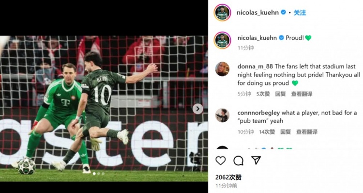 庫恩也在賽后通過社媒曬出自己單刀面對(duì)諾伊爾的射門瞬間照,并配文:“自豪!”