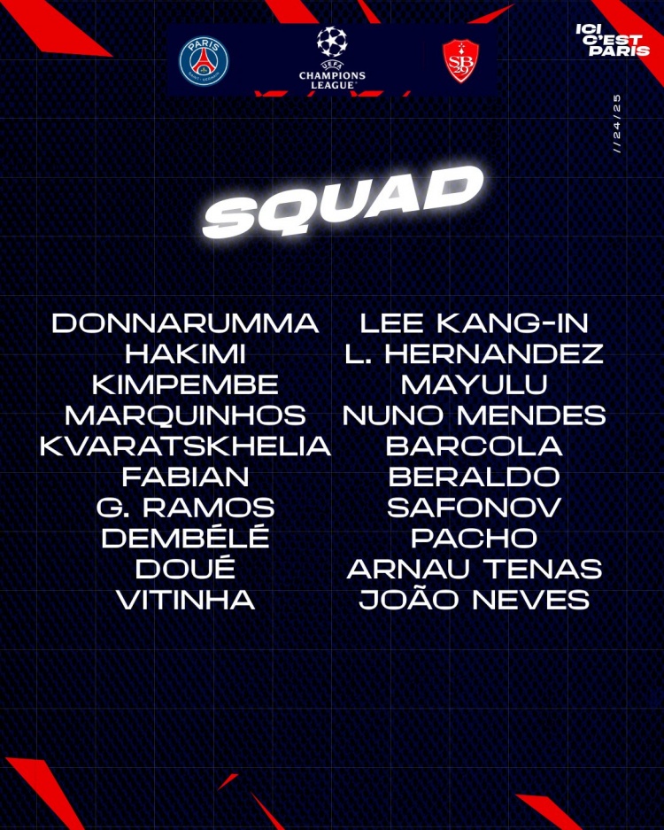 巴黎歐冠對(duì)陣布雷斯特大名單