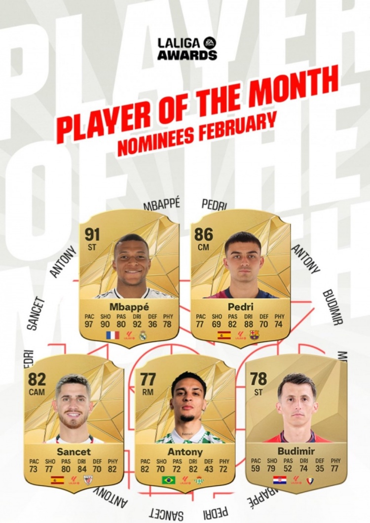 2月20日訊 西甲官方公布了2月份最佳球員的5人候選,姆巴佩、佩德里、安東尼入圍。在2月份,西甲還有第25輪比賽未進(jìn)行。