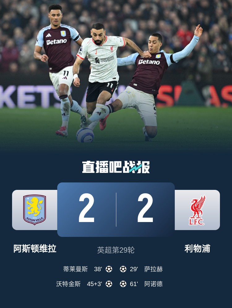 英超第29輪,利物浦2-2戰(zhàn)平維拉。上半場,加西亞回傳送禮,若塔搶斷后助攻薩拉赫破門,蒂萊曼斯扳平,沃特金斯頭球助維拉反超;下半場,薩拉赫助攻阿諾德進(jìn)球,利物浦扳平比分,努涅斯屢次錯失良機。