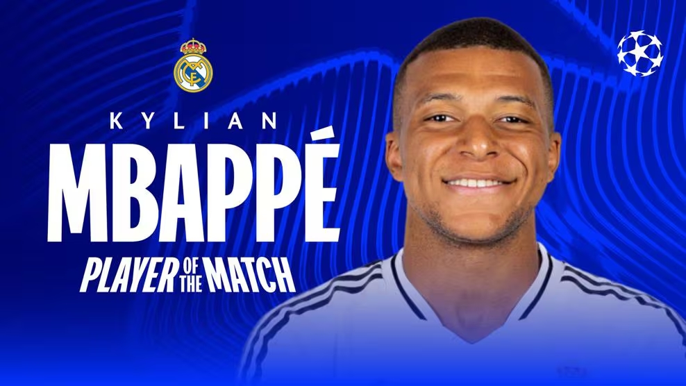 2月20日訊 皇馬在本輪歐冠3-1擊敗曼城,上演帽子戲法的姆巴佩在賽后被官方評(píng)為本場(chǎng)最佳球員。