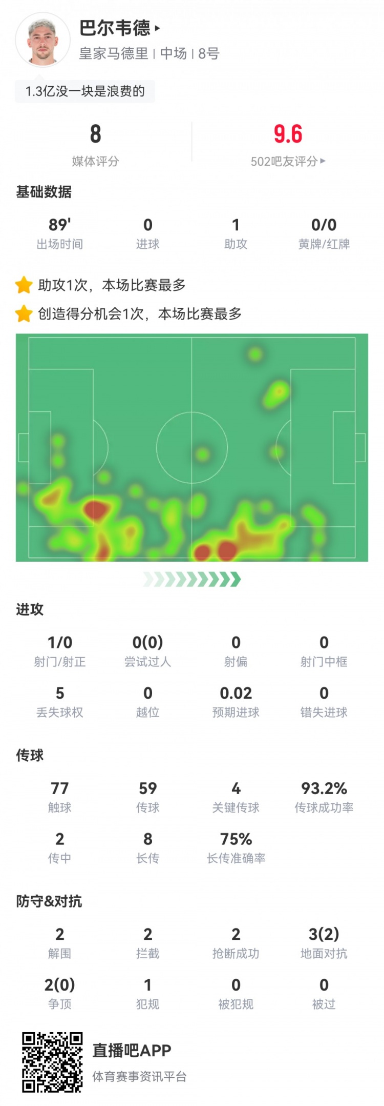 2月20日訊 歐冠淘汰賽附加賽次回合,姆巴佩上演帽子戲法,皇馬3-1總比分6-3曼城晉級16強(qiáng)!此役再次客串右后衛(wèi)的巴爾韋德發(fā)揮依舊出色,球員全場重點(diǎn)數(shù)據(jù)如下↓