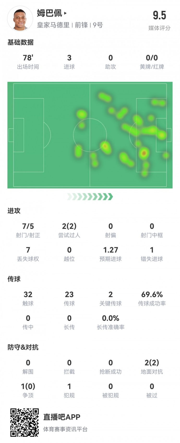 2月20日訊 正在進(jìn)行的歐冠淘汰賽附加賽次回合,姆巴佩帽子戲法,皇馬3-0總比分6-2領(lǐng)先曼城。戴帽后姆巴佩在第78分鐘被換下,球員全場(chǎng)重點(diǎn)數(shù)據(jù)如下↓