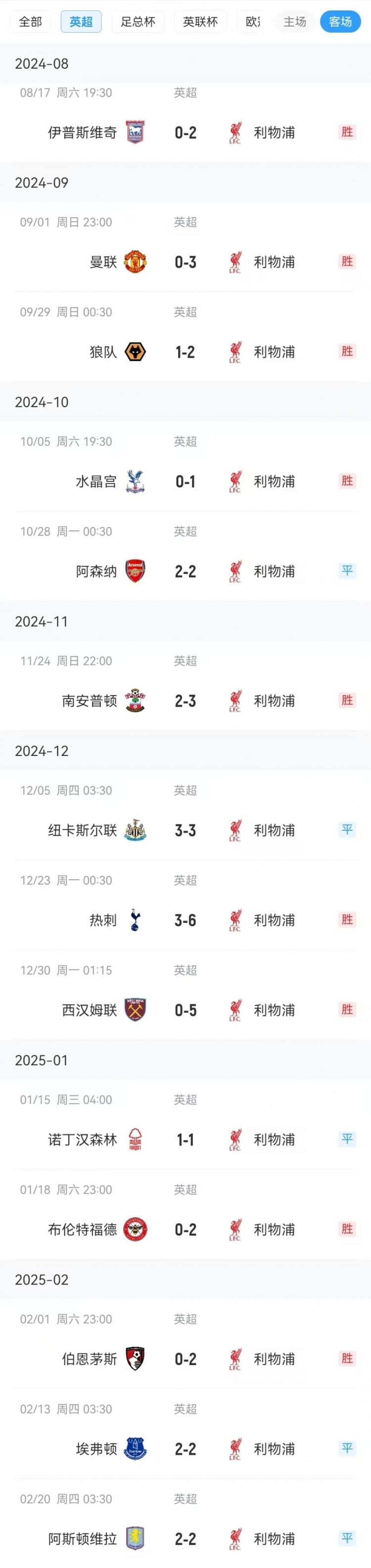 數(shù)據(jù)統(tǒng)計(jì)顯示,利物浦在本賽季共計(jì)14個(gè)英超客場(chǎng)比賽取得9勝,僅被5次逼平,至今保持不敗。
