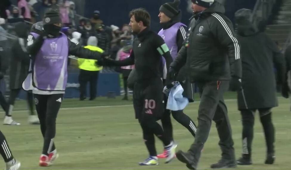 邁阿密1-0戰(zhàn)勝堪薩斯城,梅西本場比賽制勝,賽后梅西與對手球員換球衣,當?shù)貧鉁亓阆?4℃,梅西穿了厚厚的保暖服。