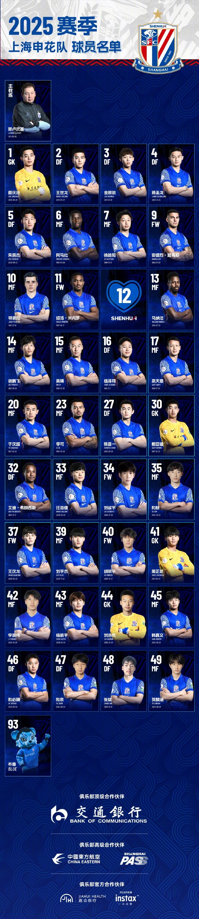 申花2025賽季球員名單