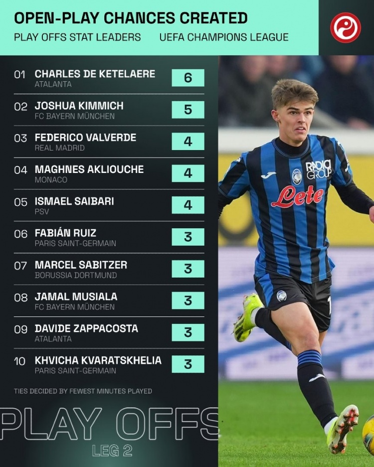 2月21日訊 根據(jù)Squawka統(tǒng)計,在歐冠淘汰賽附加賽次回合比賽中,亞特蘭大中場德凱特拉雷是運動戰(zhàn)創(chuàng)造機會最多的,一共達到了6次。