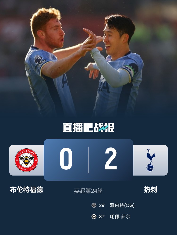 英超第24輪,熱刺2-0擊敗布倫特福德。上半場,孫興慜角球制造烏龍,雅內(nèi)特將球碰進(jìn)自家球門;下半場,維薩錯失門前近距離機(jī)會,孫興慜助攻薩爾鎖定勝局。