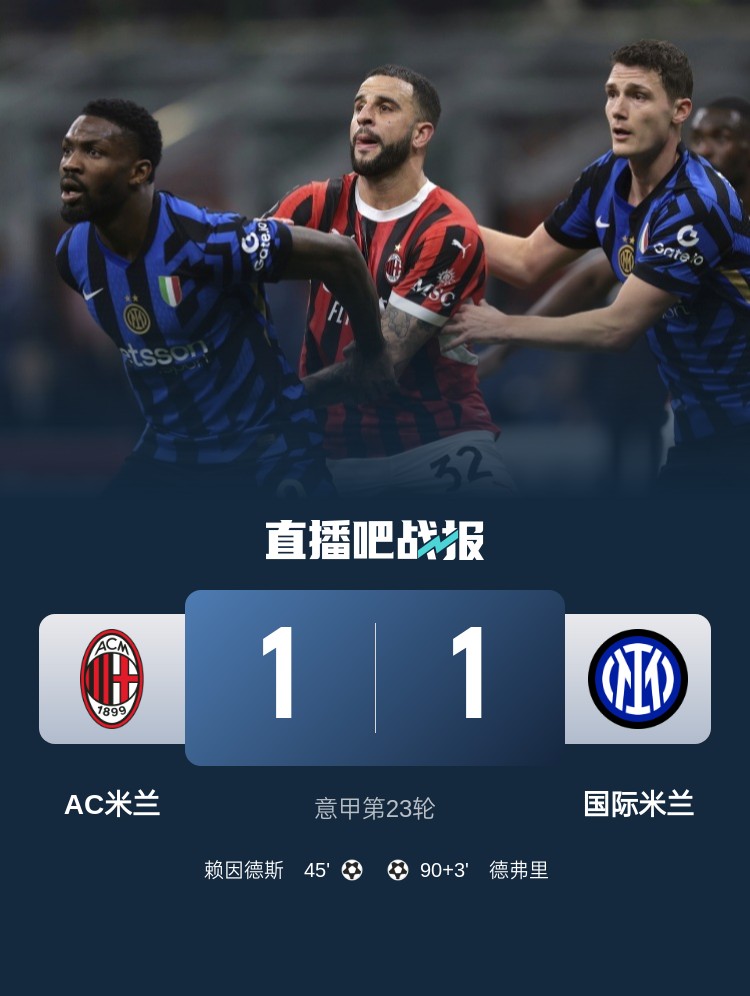 意甲第23輪,AC米蘭1-1國際米蘭。上半場,迪馬爾科、勞塔羅兩度破門無效,賴因德斯補(bǔ)射打破僵局;下半場,勞塔羅再度進(jìn)球被吹,比塞克、圖拉姆和鄧弗里斯三度中柱,扎萊夫斯基助攻德弗里補(bǔ)時扳平。