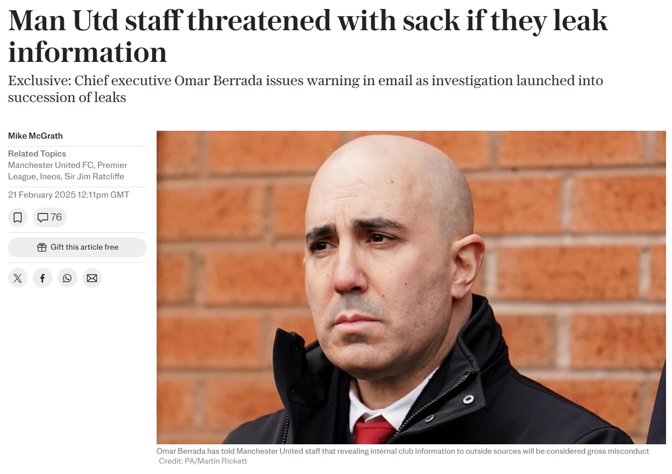 《每日電訊報》看到這封郵件的內(nèi)容中寫道:“任何向俱樂部外泄信息的人都是在違反保密義務(wù),我們非常清楚,這將被視為嚴(yán)重不當(dāng)行為。為了保護(hù)俱樂部及其同事,我們正在采取額外措施,防止未來發(fā)生違反保密規(guī)定的行為,并找出任何涉事人員。”