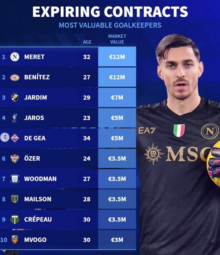 2月21日訊 《轉(zhuǎn)會市場》統(tǒng)計了今年合同到期的門將身價情況,那不勒斯門將梅雷特并列居首。