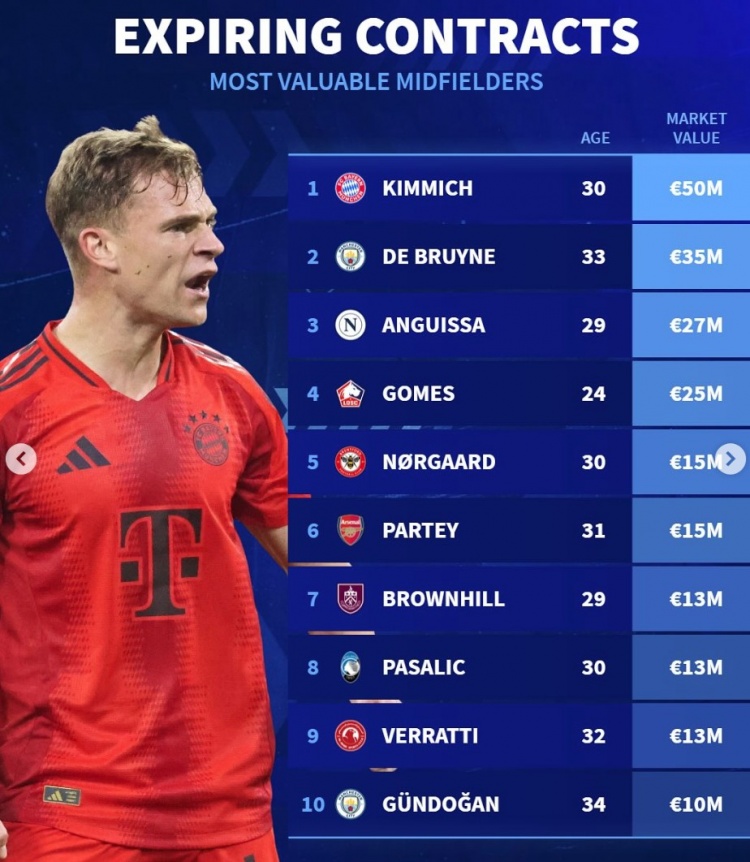 2月21日訊 《轉會市場》統(tǒng)計了合同今年到期的中場球員身價情況,基米希身價最高。