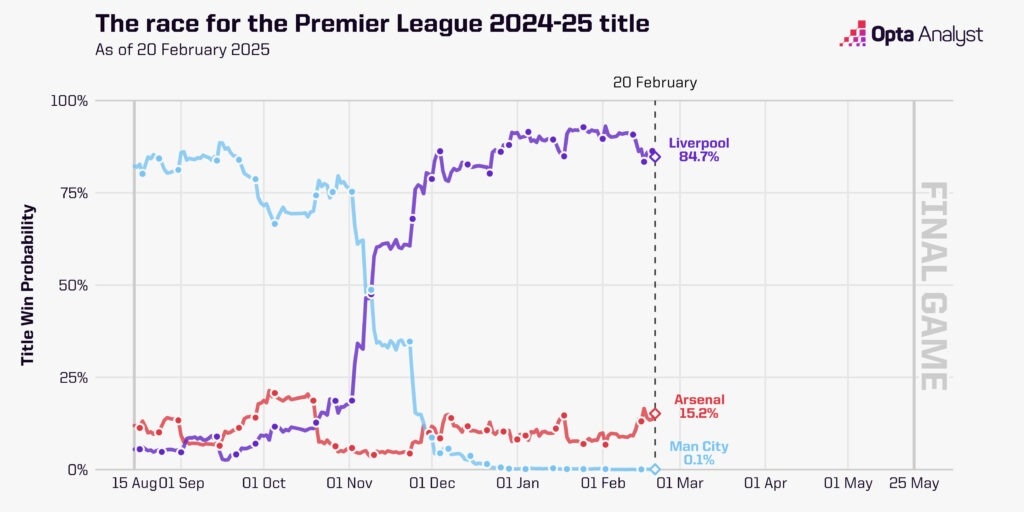 利物浦賽季初不被看好,但連續(xù)的強(qiáng)勢表現(xiàn)后,他們目前擁有84.7%的奪冠概率,最高時達(dá)到90%。